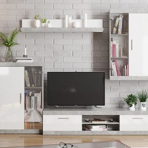 • Сучасна стінка для вітальні з тумбами під телевізор, пеналами та полицями.