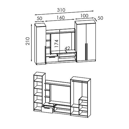 довжина – 310 см., глибина – 50 см., висота – 210 см.