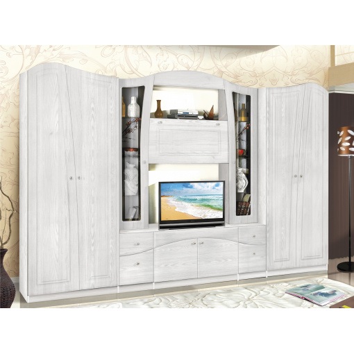 “Стінка” чудово поєднує естетику і практичність. Завдяки добре організованим матеріалам і фурнітурі ці меблі мають довгий термін експлуатації І індивідуальність цієї моделі корпусних меблів полягає в оригінальних формах обличчя. Вишуканий візерунок на поверхні фасадів підкреслює витонченість фрески.