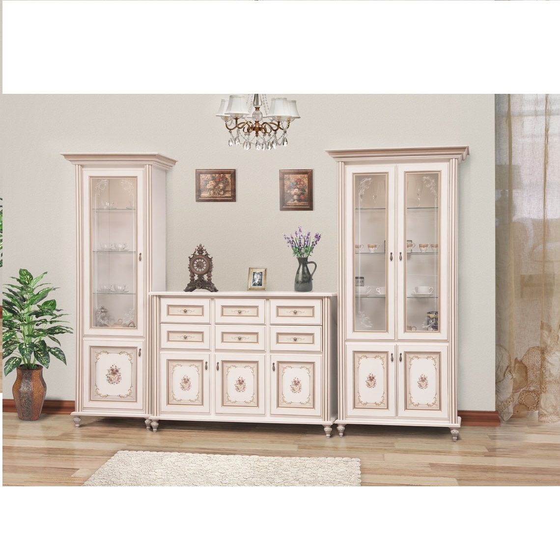 Комплект 3.0 модульної системи Парма від меблевої фабрики Світ Меблів виготовлена в ніжному вінтажному стилі. Всі фасади прикрашені декоративними малюнками, фігурної рамкою і ніжками з красивим візерунком. Фрезеровані деталі покриті золотою патиною, що додає меблям особливого і трохи чарівного виду. Перевага Парми в тому, що є чималий вибір модулів: вітрини, ТВ-тумби, комоди.