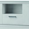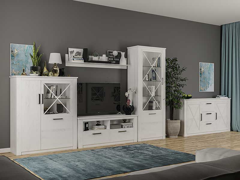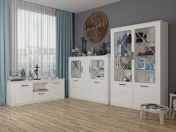 Вітальню прикрасять вишукані пенали-вітрини з тендітною рамочкою на склі, ТВ-тумби на вибір різних дизайнів та розмірів.