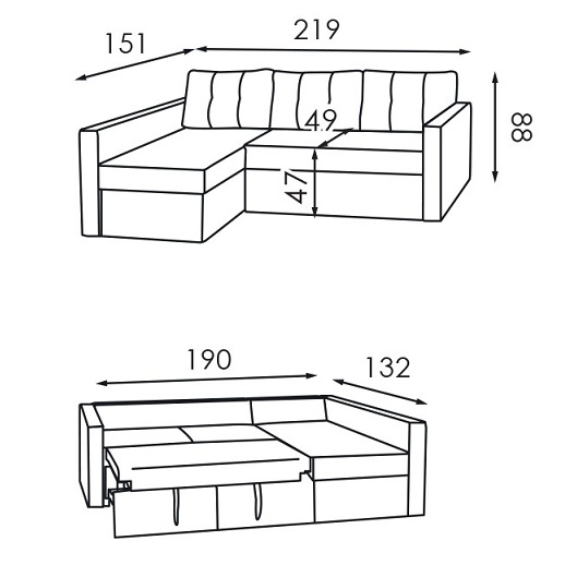 довжина – 219 см., глибина – 86 см., висота – 88 см.