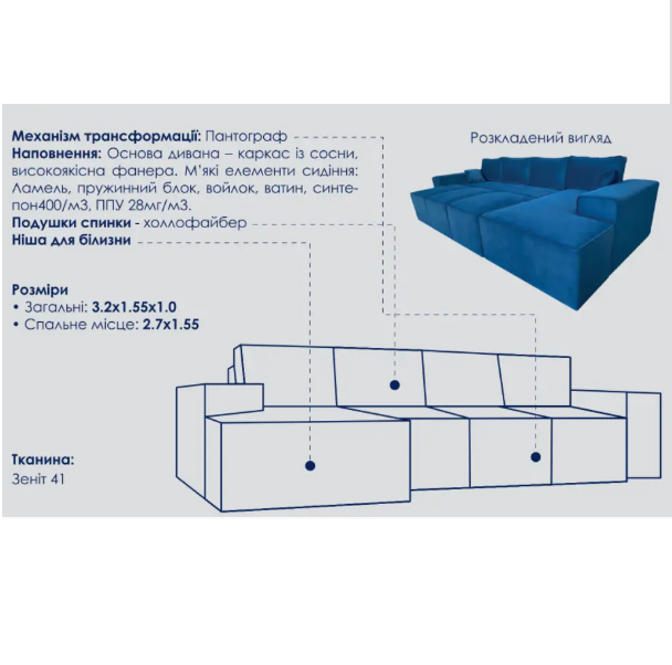 Наповнення: Основа дивана – каркас із сосні, високоякісна фанера.