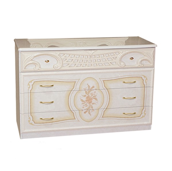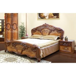 Модульна спальня “Кармен нова” від компанії Світ Меблів – ніжна, витончена та вишукана спальня, яка не залишить уваги ні одного поціновувача прекрасного. Прекрасний дизайн спальні перенесе Вас у період класицизму, коли стилю притаманна функціональність, строгість прямих ліній, проте декоративні елементи у вигляді лакових хвилів корон, що стали окрасою на прямому карнизі шафи, букети троянд на дверях, тонкий золотий візерунок на фасадах робляю спальню величною.  Королівське ліжко прийме Вас в свої обійми, а велика вмістка шафа, масивний комод, невеликі приліжкові тумби допоможуть навести порядок в кімнаті.