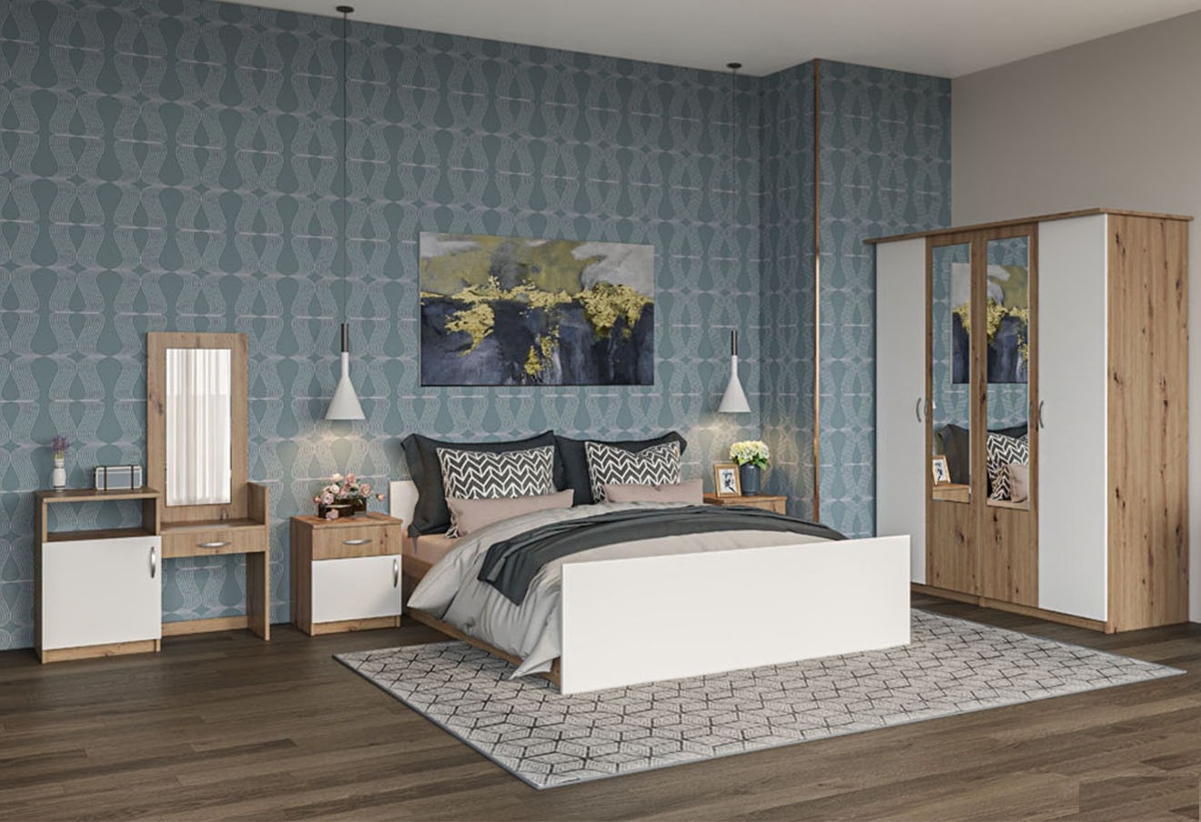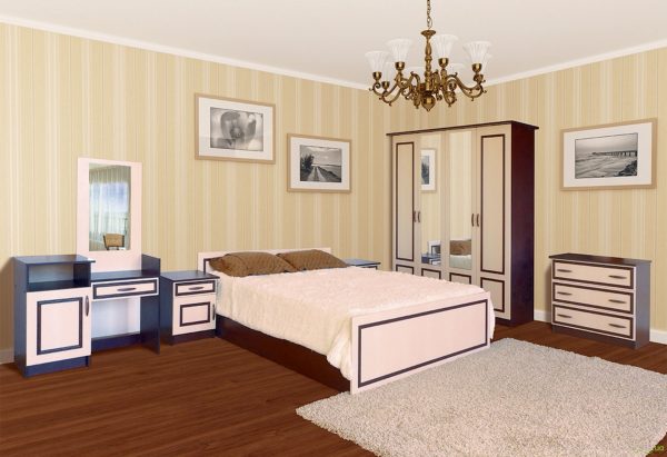 Модульна спальня Кім – це одна із новинок фабрики СМ. Корпус спальні виконується в кольорі “венге темний”, а фасади комбіновані кольорами “венге темний” та “венге світлий”. Фабрика використовує якісну ДСП та фурнітуру вітчизняного виробництва. Спальня може продаватись помодульно та в комплеткі. В неї входить широка містка шафа для білизни та вішаків, двоспальне ліжко без вкладу, зручний невеликий комод, приліжкові тумби та туалетний столик з шуфлядами та тумбочками. Такий комплект буде контрастно та стильно виглядати у Вашій спальні.