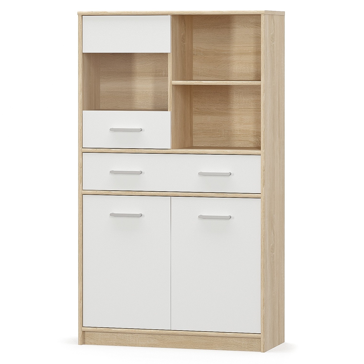 Стильний комод вітрина 1В2Д1Ш Тіпс, шириною 83 см і глибиною 34 см. Складається зі скляної секції; шухляди; тумби з полицями, двох відкритих полиць. Виготовляється з ДСП класу Е1, у двох варіантах кольорів: корпус дуб сонома з білими фасадами, або корпус і фасади дуб сонома. Належить до модульних меблів Тіпс, ви можете підібрати відповідний комплект до вітальні в скандинавському стилі.