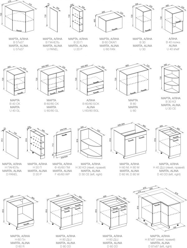 В комплект кухні входять наступні елементи в см. (ширина/висота/глибина):