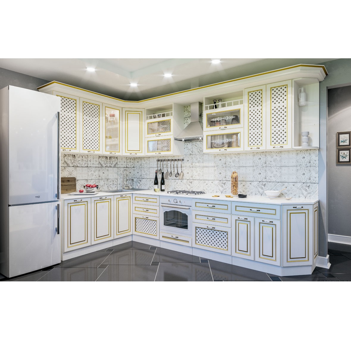 Кухня виготовлена з високоякісних матеріалів: корпус кухні виготовлений з ламінованого ДСП з підвищеною стійкістю до вологи та температур, а фасад – патинований МДФ. Направляючі до шухляд телескопічні (повного висування). На деякі шухляди (маленькі) – роликові. Підсвітка до вітрин в комплекті. В комплект до кухонних тумбочок входить повний комплект фурнітури.