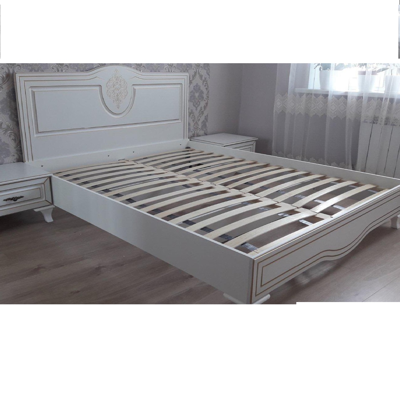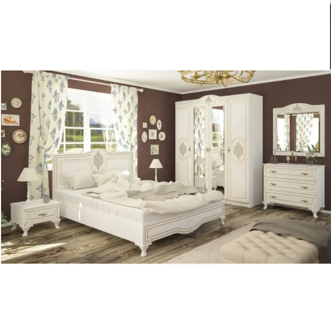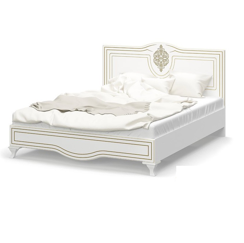 Двоспальне ліжко “Мілан”, від львівськї фабрики Мебель Сервіс, виготовлена в класичному стилі в білому матовому кольорі на ніжках з дерева. Узніжжя та узголів’я ліжка виготовленні з МДФ з патинуваням.