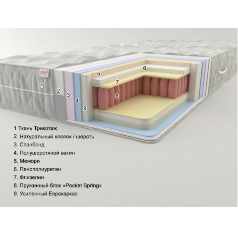 Меморі екологічно чистий, гіпоалергенний матеріал, відмінно підтримує оптимальний температурний фон, гігієнічний та стійкий до утворення грибків та пилових кліщів. - Ватин виконує ізоляційну функцію між основними настилами та чохлом.