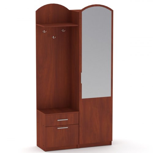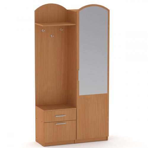Передпокій Лідія – від виробника Компаніт – велика та містка. Виготовлена за сучасними технологіями, поєднує у собі високу якість за невеликі гроші. Передпокій складається з вішалки відкритого типу (з трьома гачками), висувної скриньки, тумби для взуття, а також шафи з дзеркалом на фасаді дверей та нішою внизу. Буде відмінним доповненням Вашого передпокою.