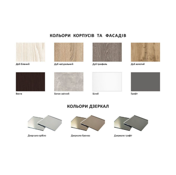 • Шафи-купе та фасади нестандартного кольору (Дуб золотий, Бетон світлий) +10% до вартості.