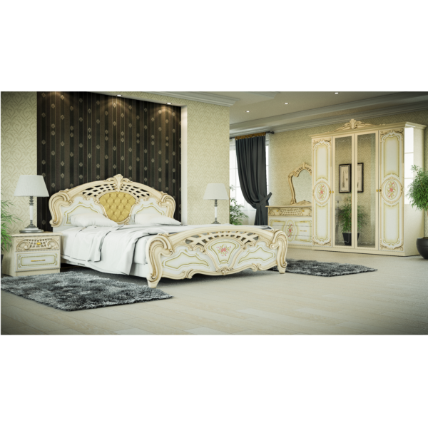 Спальня Кармен нова Люкс представлена фабрикою Світ Меблів – це благородна, велична, приваблива, комфортна та зручна спальня для Вашого дому виконана у стилі “прованс”. Родзинкою цієї спальні є оригінальні 3D накладки на ліжку, шафі, дзеркалі, в поєднанні з малюнком і патинуванням.