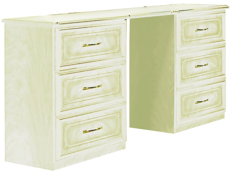 Модульна спальня виготовлена з високоякісних матеріалів: корпус – ДСП, фасад – глянцевий ДСП. Кольорова гама: корпус – піно, фасад – піно, художній друк, патина. Елементи з висувними ящиками на направляючих повного висування.