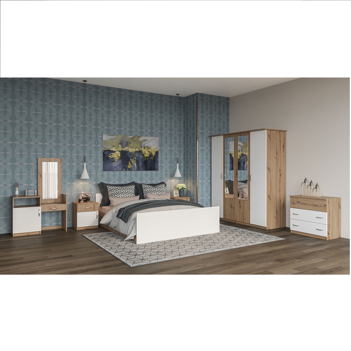 Модульна спальня Кім New — це одна з новинок фабрики СМ. Фабрика використовує якісну ДСП і фурнітуру вітчизняного виробництва. Спальня може продаватися помодульно та в комплекті. В неї входить широка містка шафа, двоспальне ліжко, невеликий комод, приліжкові тумби та туалетний столик з ящиком і тумбочкою. Такий комплект буде контрастно та стильно виглядати у вашій спальні.