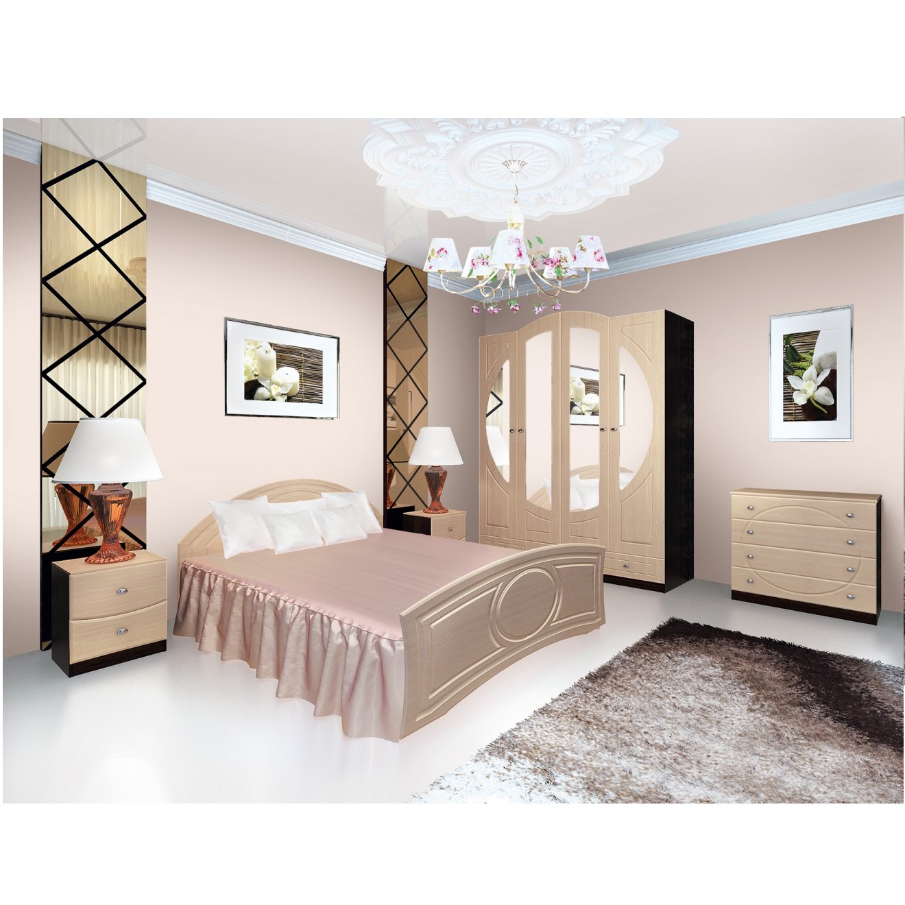 Елементи даного спального гарнітура відрізняються грамотно продуманною і точною конструкціями. Фасади шафи оснащені великими зручними дзеркалами. А само спальне місце, сконструйоване таким чином, щоб сон на ньому був комфортним і повноцінним. Високою функціональністю відрізняється комод, оснащений вмісними зручними ящичками. Ящики оснащені роликовими направляючими, отвечающими для легкого відкриття і закриття меблів.