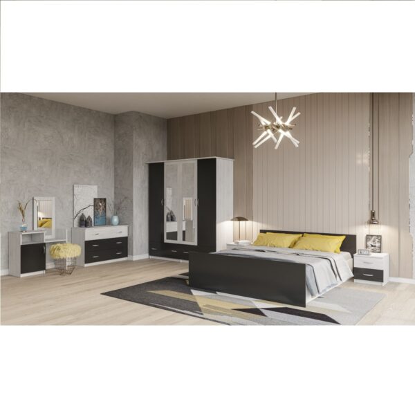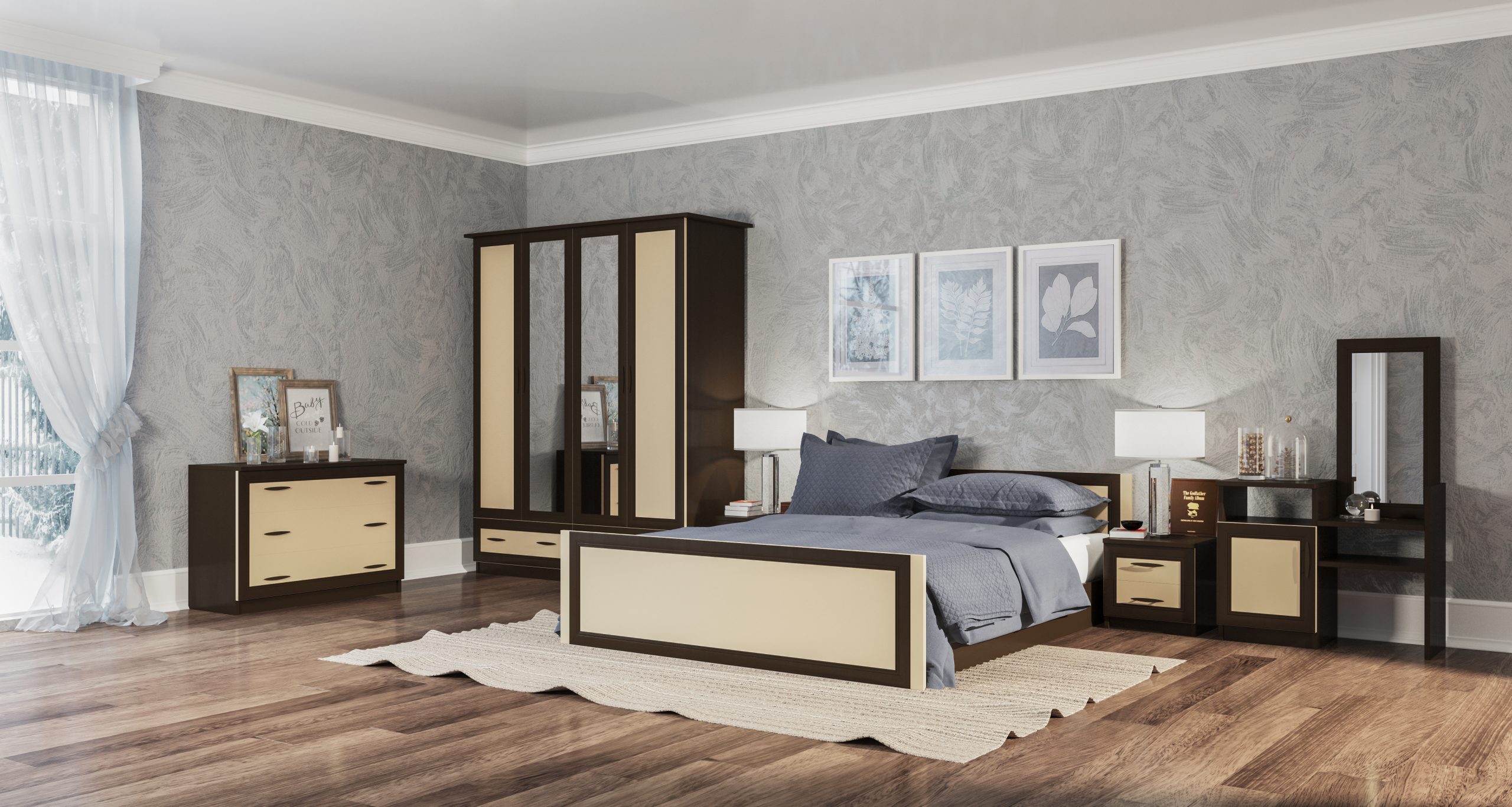 Модульна спальня виготовлена з високоякісних матеріалів: корпус – ДСП, а фасад – ДСП з накладками МДФ.