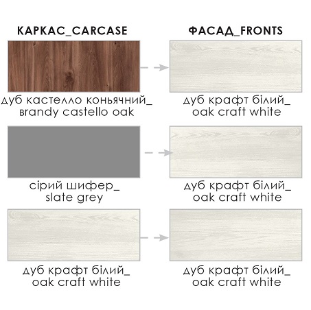 Колір каркасу/Фасад ДСП: дуб кастелло коньячний + дуб крафт білий, сірий шифер + дуб крафт білий, дуб крафт білий + дуб крафт білий