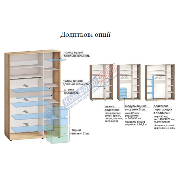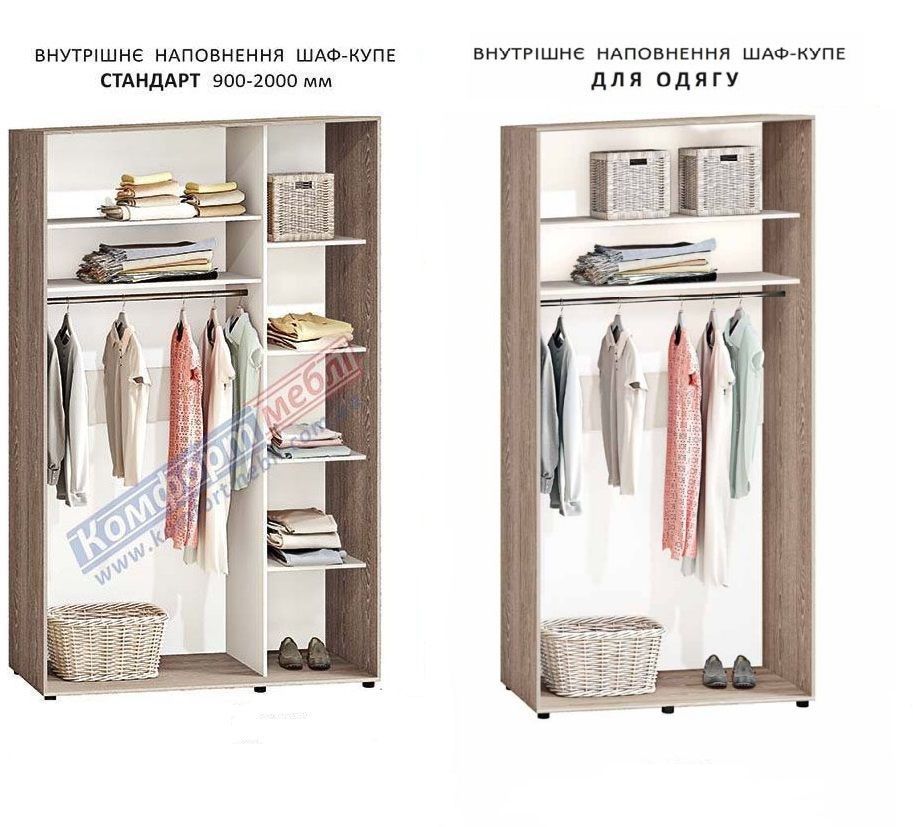 • Всі шафи-купе можливо виготовити нестандартної ширини, висоти (з інтервалом 5см) – вартість збільшується на 30% від наступного стандартного розміру.